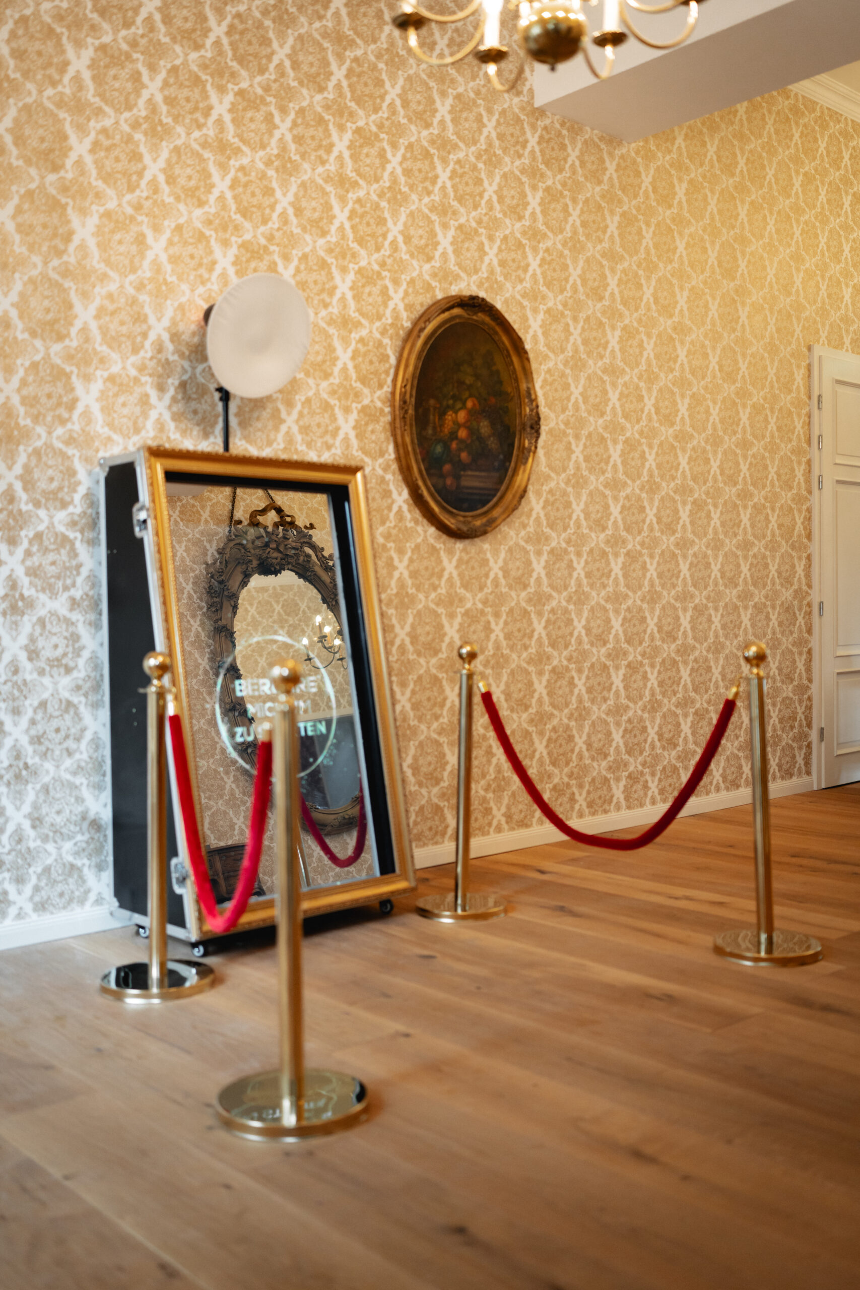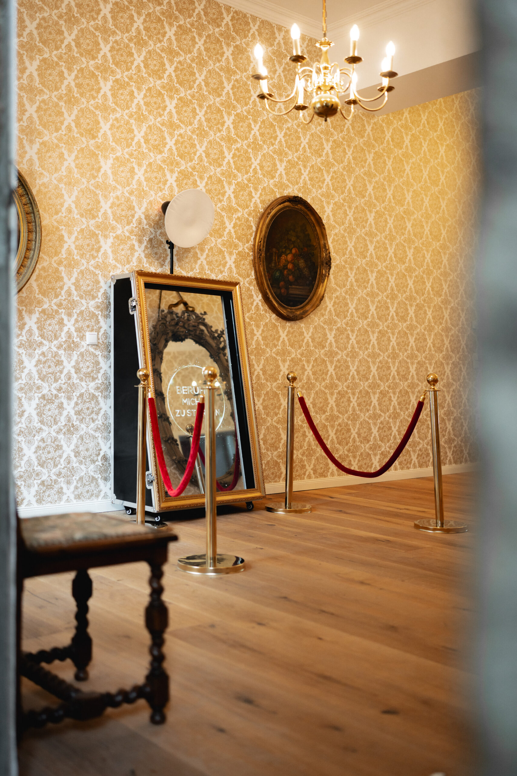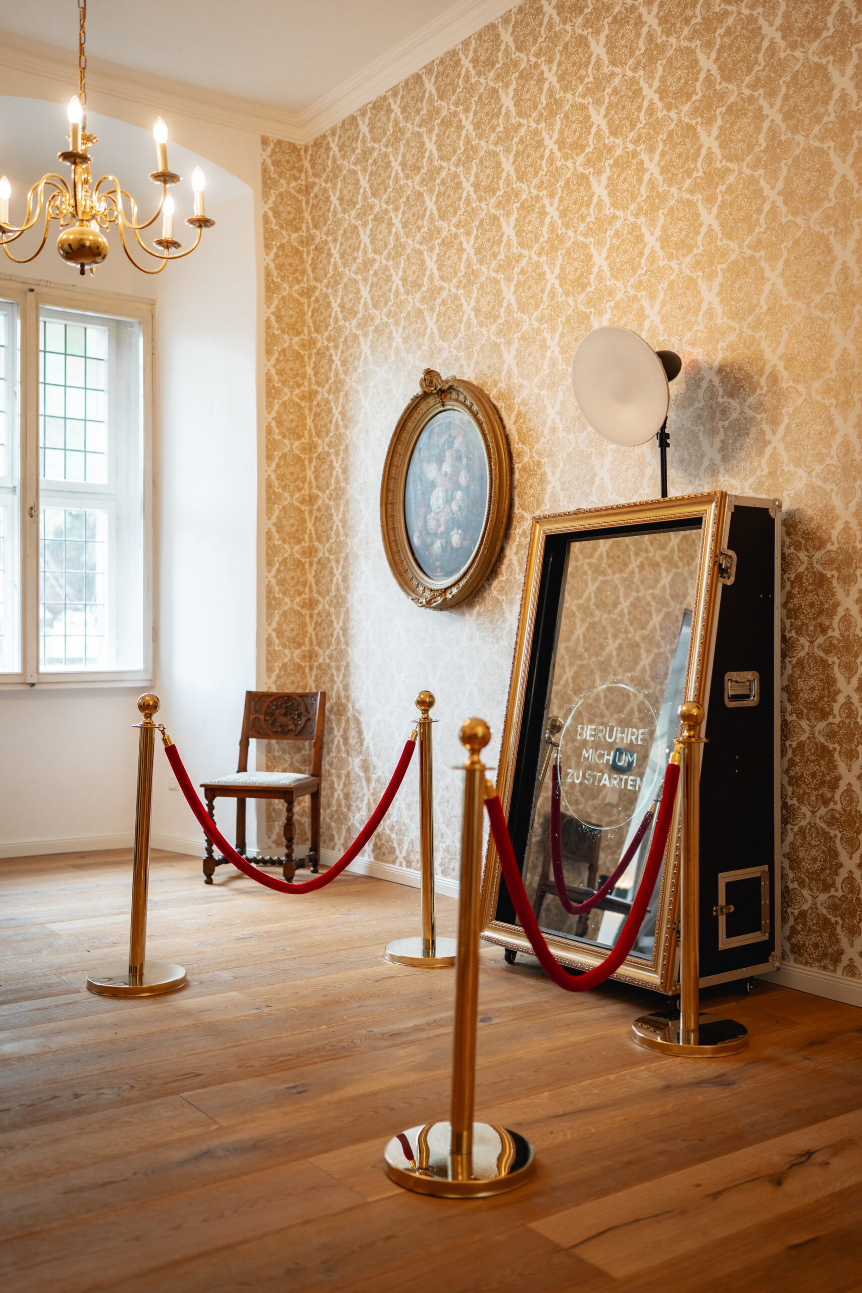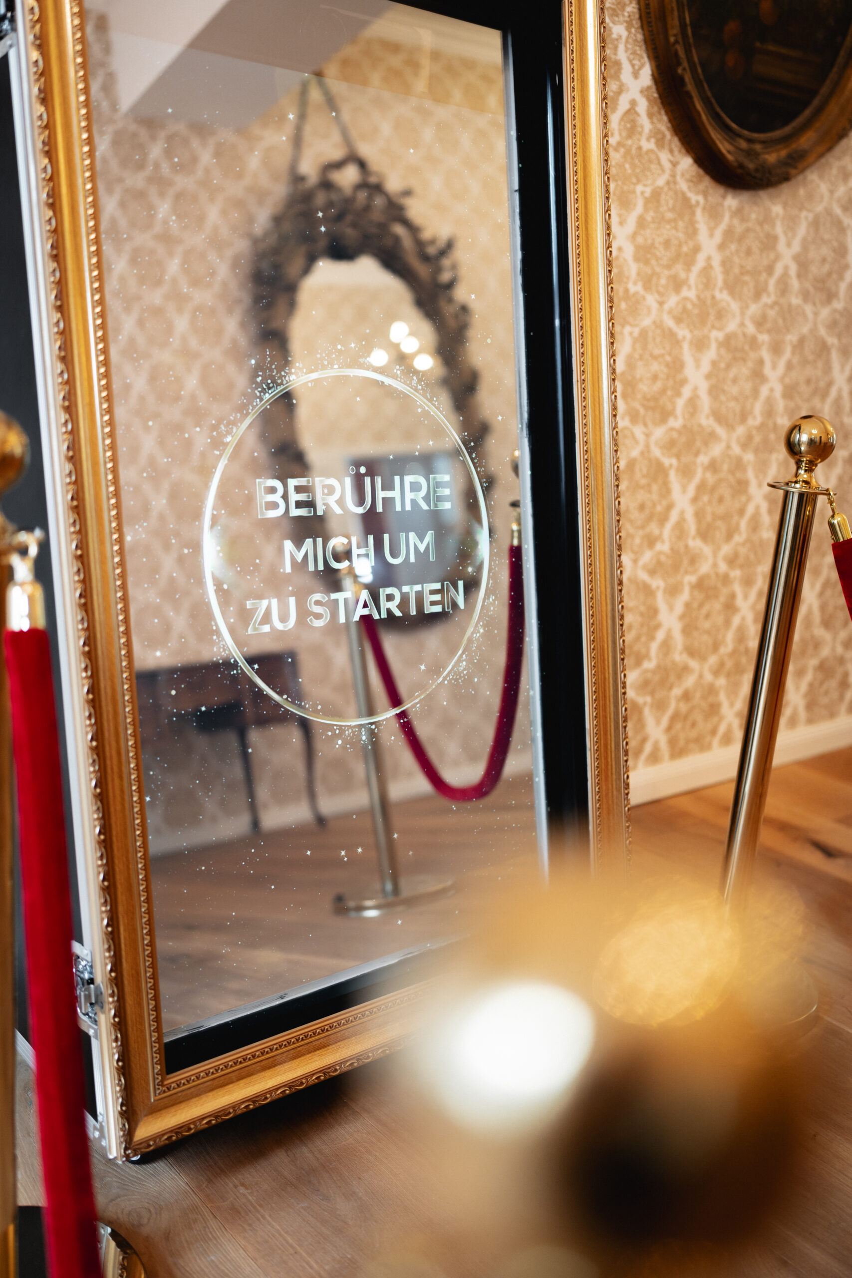 Halte die schönsten Momente fest, gemeinsam mit all deinen Liebsten. Der 64-Zoll-Premium-Fotospiegel lädt zu großen Gruppenfotos ein und sorgt für echte Highlights auf deiner Feier. Der elegante Rahmen in Gold oder Silber macht den Spiegel zu einem Hingucker und auf Wunsch sind auch individuelle Designs möglich.